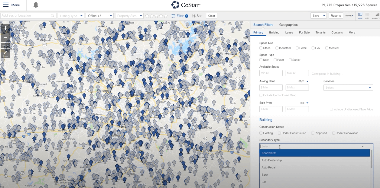 CoStar is a one-stop shop for all things commercial real estate. Generating lists of off-market deals is just one of many different services provided by CoStar. Because of the level of detail on the commercial properties in CoStar’s database (which comes from public records and CoStar research), you can select from countless filters to generate a list of potential deals. Based on your filters, like PropStream, the results are available presented on a map.