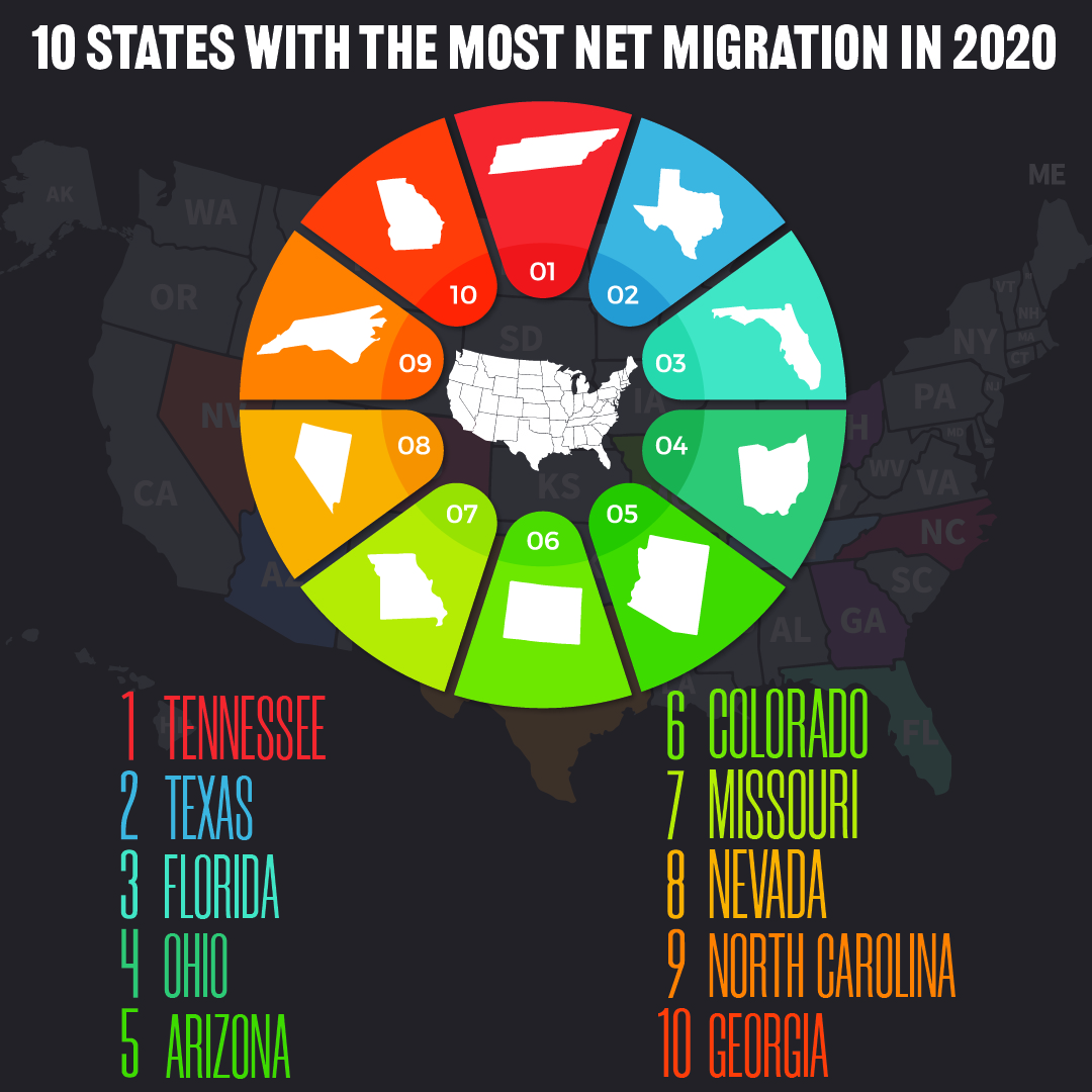 Click here to see how all 50 states ranked, and here are the 10 states with the most net migration in 2020: