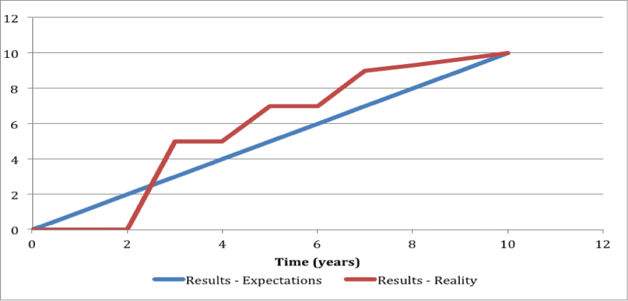Unfortunately, this “enjoy the path” mindset does not fit well into our current zeitgeist of instant gratification and “get rich quick” mentality that are many individuals, including real estate investors, default approach to life. As a result, many investors quit, give up early, or never get started at all. The reason? – a gap between expectations and reality, in terms of growth.