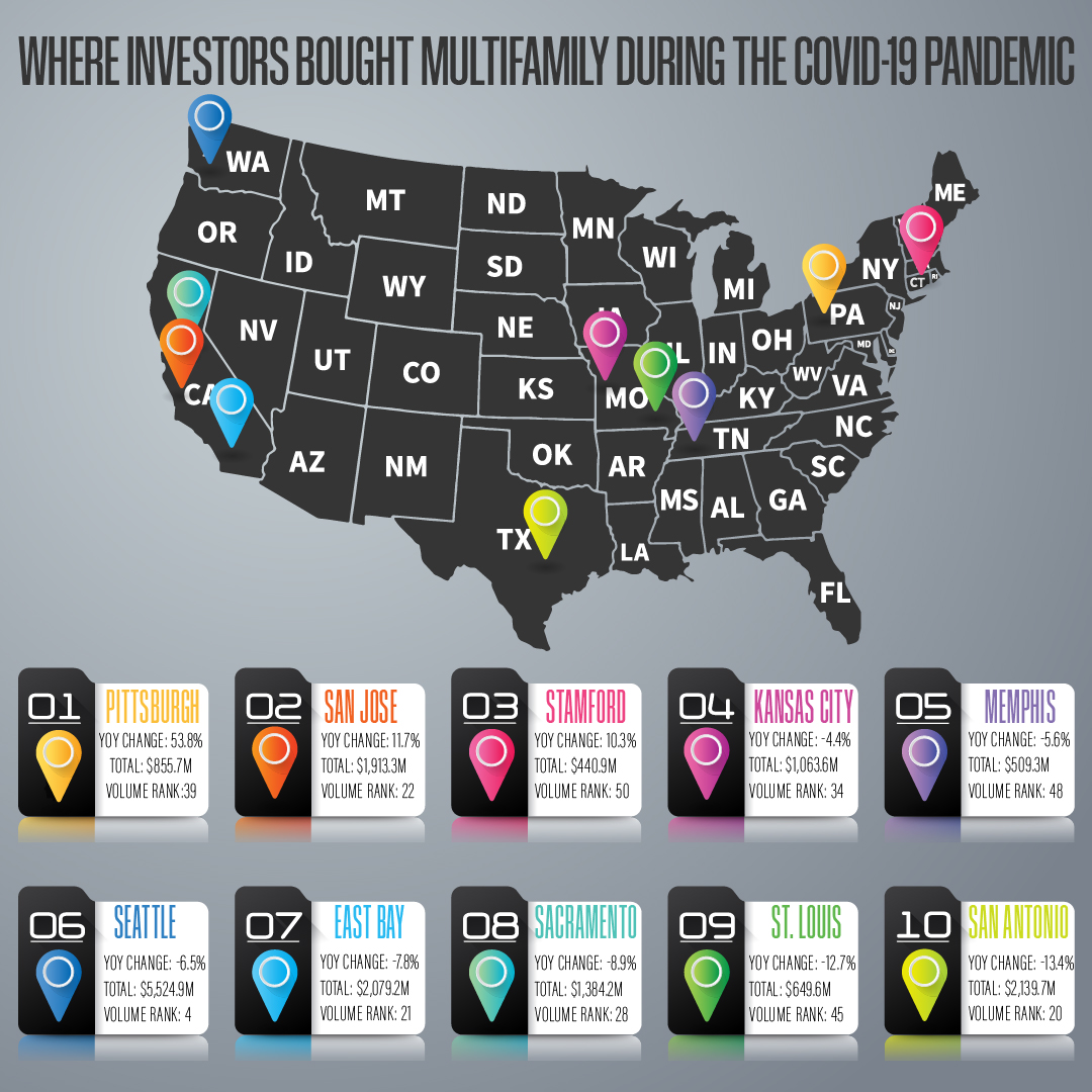 As a baseline, according to the report, the total multifamily transaction volume in 2020 was down 40% year-to-date, although it still had the highest total transaction volume of the other commercial real estate industries. Only three markets experienced an increase in multifamily transactions in 2020 – Pittsburgh, San Jose, and Stamford, CT. The greatest increase was in Pittsburgh with over 50% more transactions in 2020 compared to 2019, making it one of the “hottest” multifamily market in 2020.