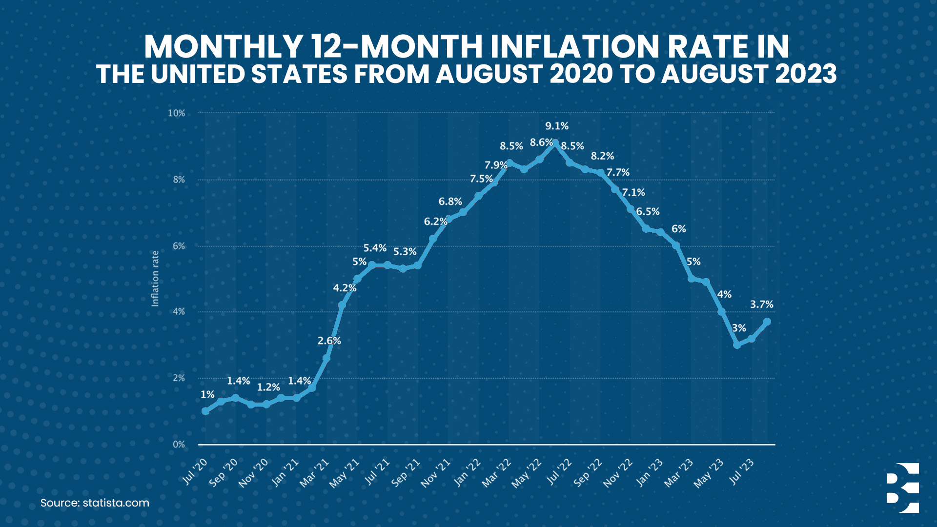 Inflation topped out at a whopping 9.1% in June 2022. It declined to 6.4% in January of 2023 and fell further to 3% in June. Since then, it’s gone up again, reaching 3.7% in August — contrary to the government’s 2% target.