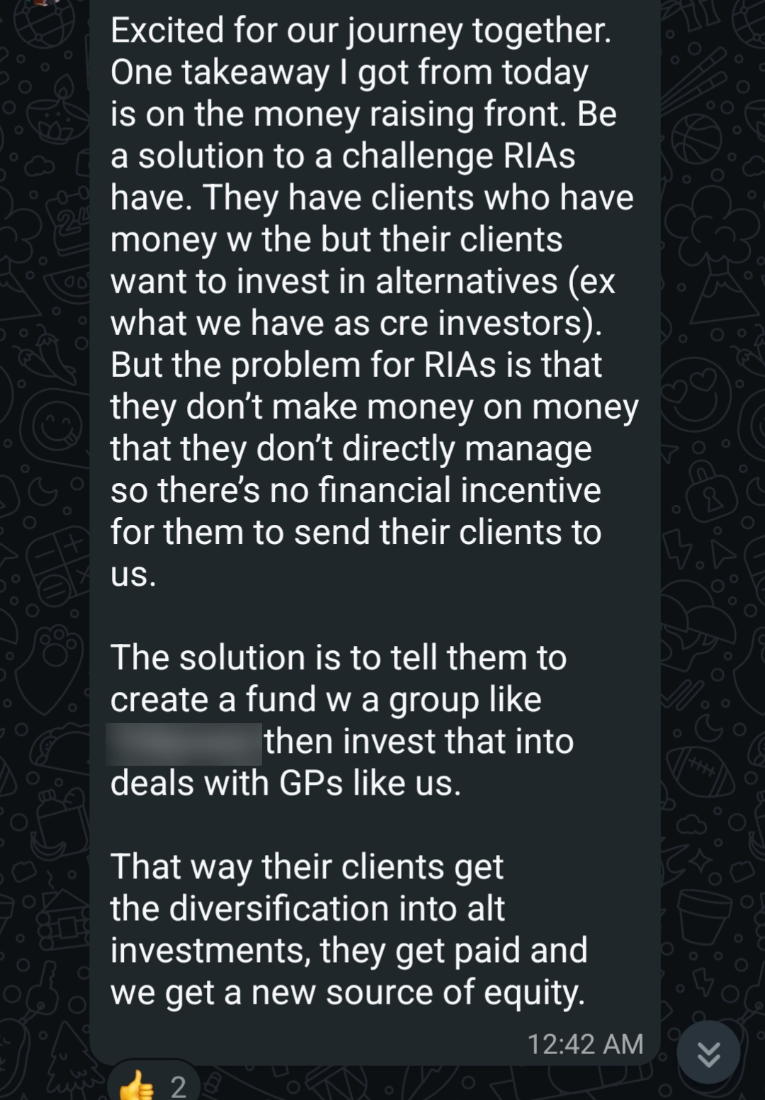 Every member is a serious operator or fund manager navigating today's market in real time. When you bring your biggest challenge to this group, someone has already faced it — or is facing it right now. That's not a coincidence. That's by design.