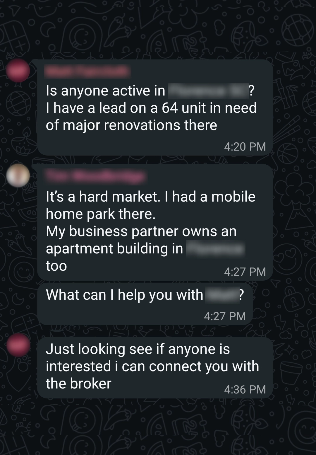 A private group chat with 24/7 access where members share deals, ask questions, and help each other in real time — not just on scheduled meetings.