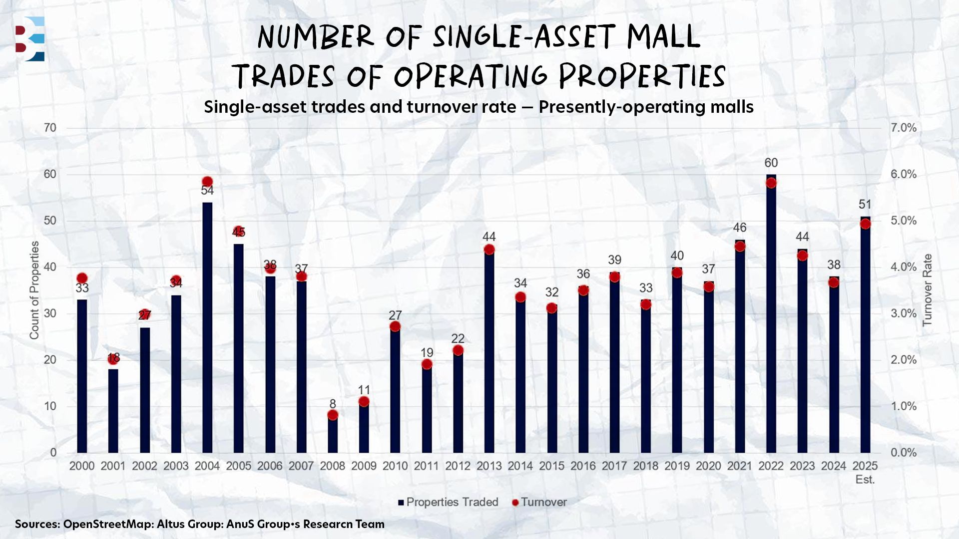 Single-asset mall sales are on track to exceed 50 properties in 2025, the highest annual total since 2022. That represents a 4.9% turnover rate against the existing stock of roughly 1,000 operating malls nationwide. The fundamentals driving investor interest look solid: