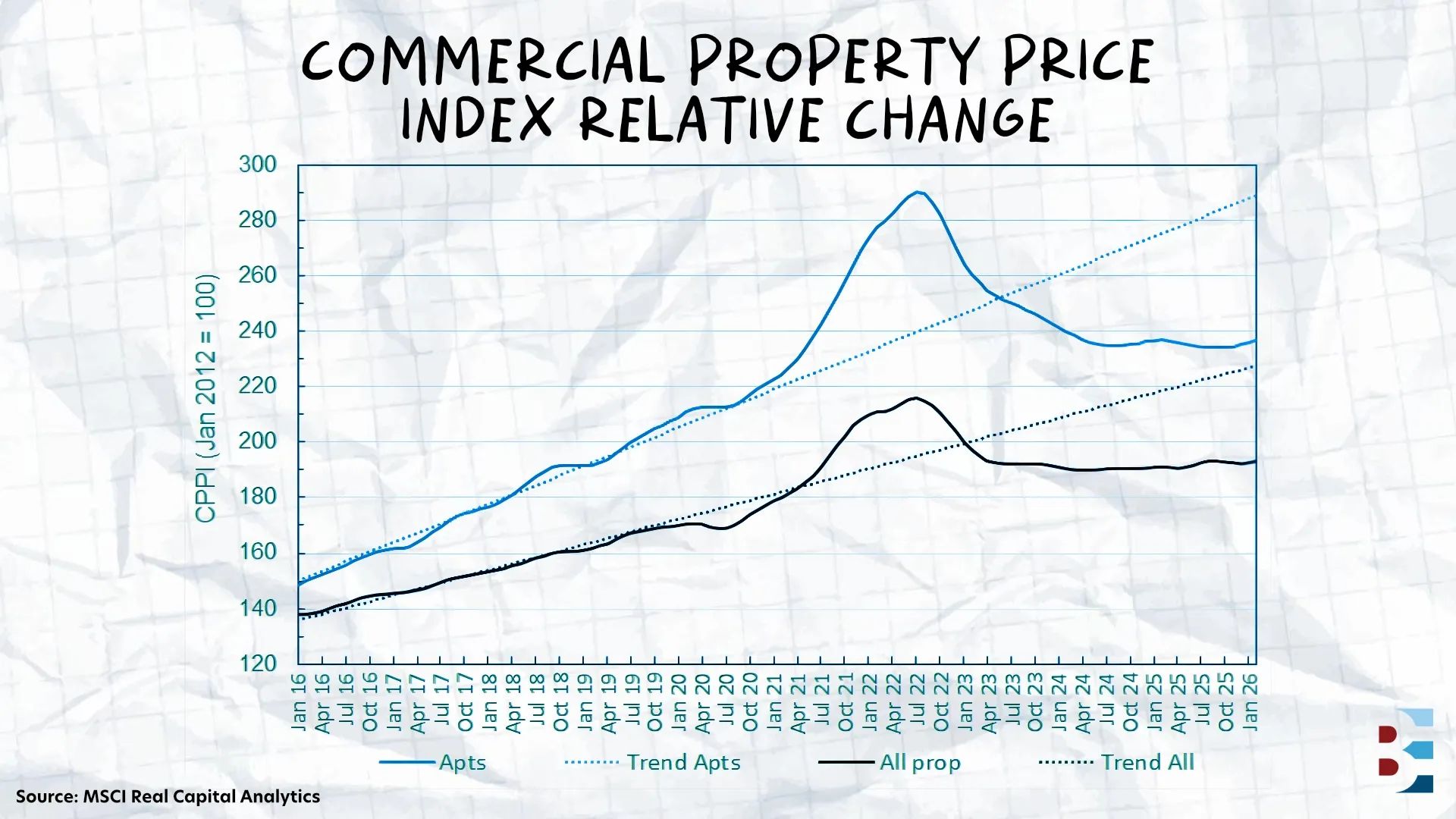 Multifamily property prices have risen for five consecutive months, posting a 0.1% gain YoY in February — the first annual increase since December 2022. Prices remain 18.3% below their peak but have climbed 13.4% above January 2020 levels.
