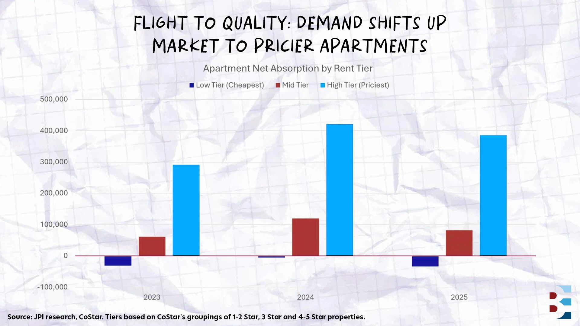 The apartment market's demand story isn't playing out where most people expect it to. Over the past three years, renter households in upper-tier apartments have grown by 1.1 million, while mid-tier units added 263,000 renters and lower-tier apartments actually lost a net 70,000.
