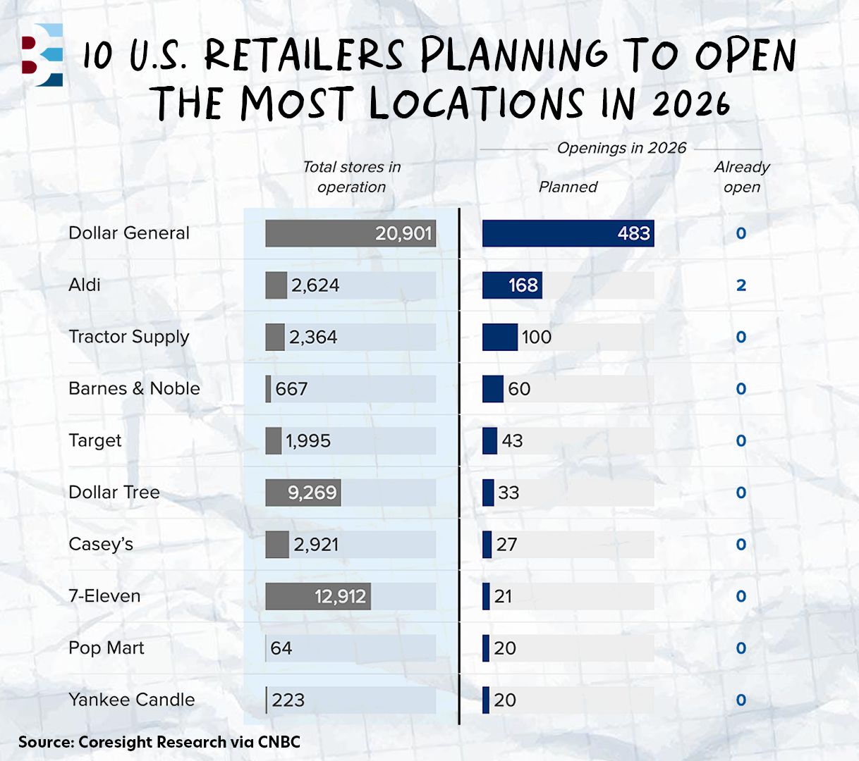 Store closures across the U.S. are projected to fall to their lowest level in three years as the retail industry moves beyond a major wave of bankruptcies that reshaped the sector. Coresight Research expects retailers to close approximately 7,900 stores in 2026, down 4.5% YoY, while openings are forecast to rise 4.4% to roughly 5,500 locations.