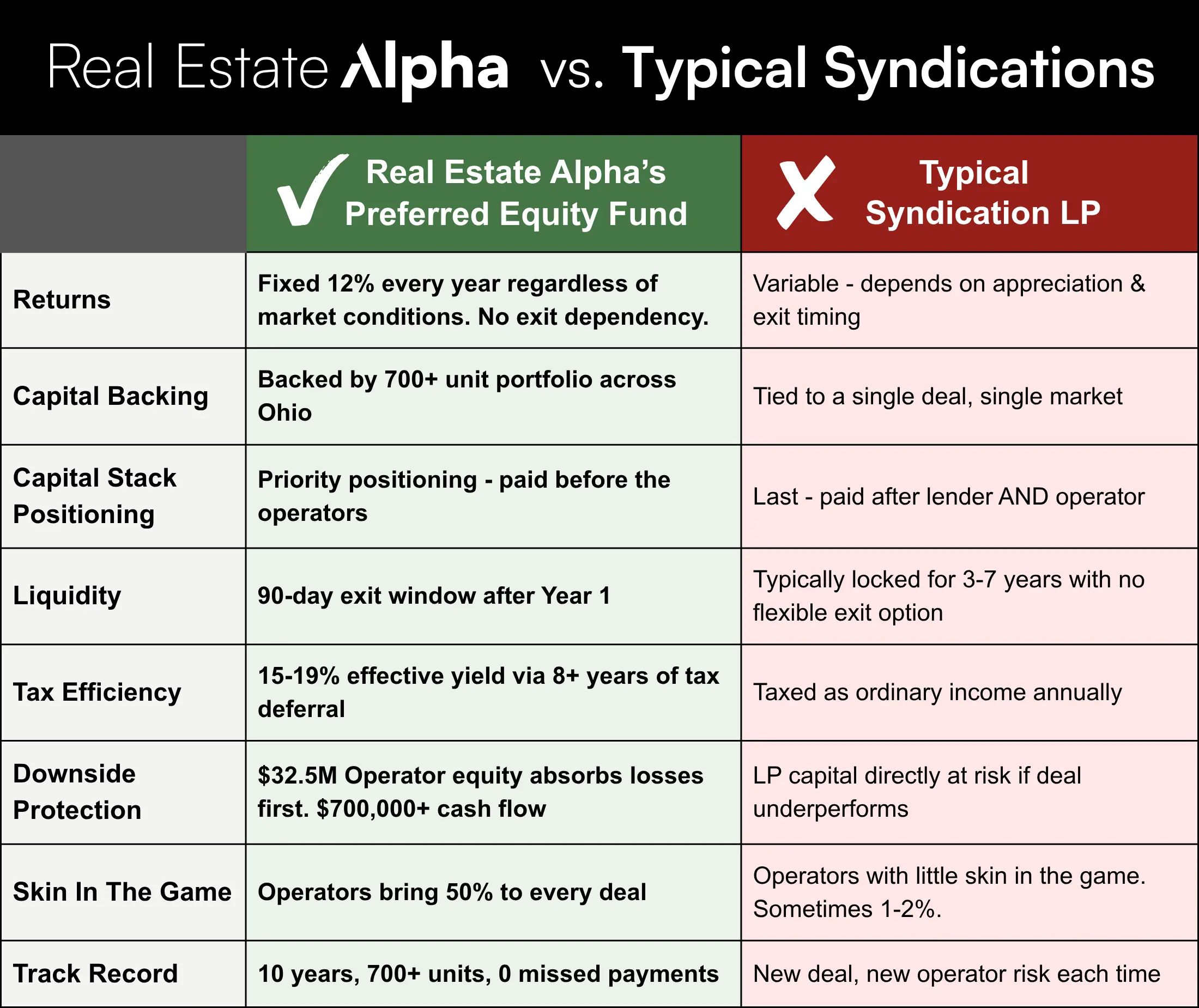 Real Estate Alpha flips that structure entirely. Fixed 12% annual return instead of projections. Preferred equity position above the operators instead of an LP position at the bottom. 90-day liquidity after year one instead of a multi-year lockup. And an entire $75M+ portfolio of 700+ units backing your investment instead of a single deal.