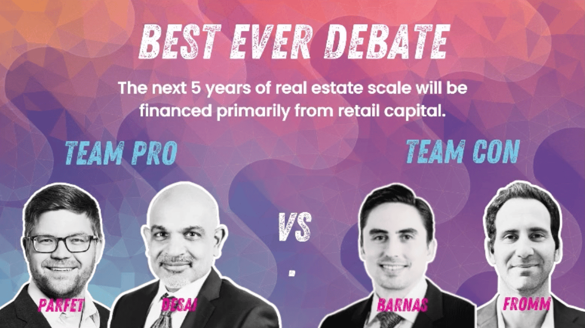 The Motion: The next five years of real estate scale will be financed primarily from retail capital. Two investors argued for, two argued against, and a live audience poll determined the winner.Β