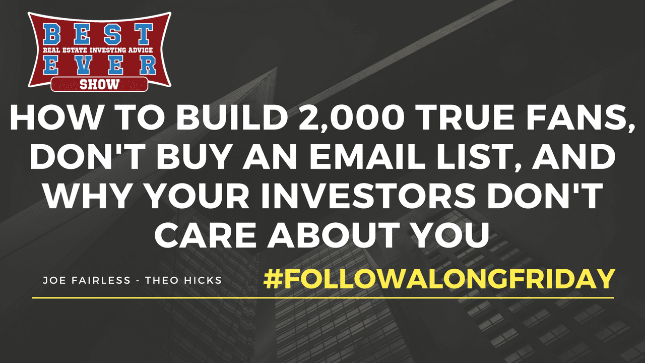 A spinoff from Tim Ferris and his "1000 true fans", Joe and Theo share the magic of strengthening and maintaining that 2000 investor core. They preach never to buy an email list and share their unfortunate experience, and Joe spells it out as to why your investors could care less about you? hint, you need to send him emails and other correspondence regularly.