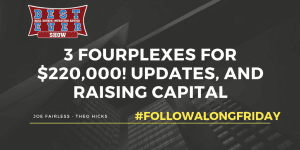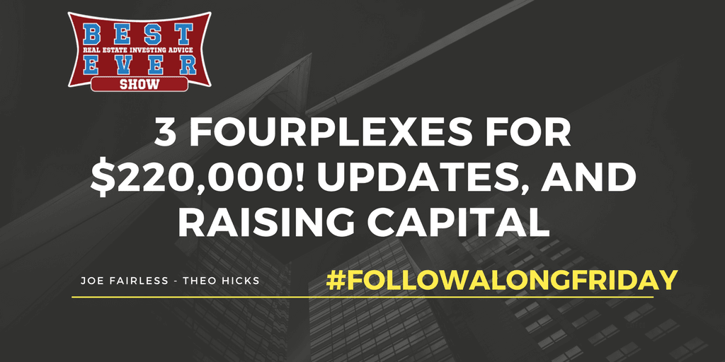Yes, 3 Fourplexes for $220,000, scored by Theo! Hear about his networking hack that you need to implement TODAY. (cough cough) It involves social media. Hear about some updates with Joe, a recap from the BiggerPockets podcast interview, and of course Joe covers raising capital for other people's deals.
